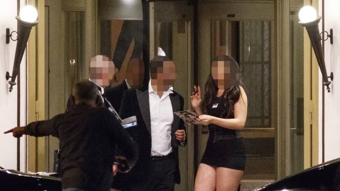 Hostess greeting men arriving at the President's Club Dinner © Tolga Akmen/FT